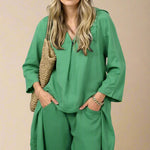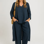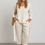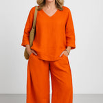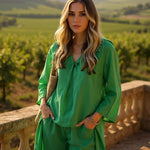 Norena™ giver dig det bedste fra begge verdener: komfort og stil. Dette lette, luftige sæt med top og bukser er perfekt til både hverdagsbrug og små begivenheder – uden at gå på kompromis med din bevægelsesfrihed.