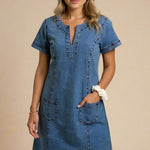 Let og afslappet denimkjole med V-udskæring, korte ærmer og praktiske lommer foran. Det løse snit giver bevægelsesfrihed og komfort, perfekt til varme dage eller en casual hverdagsstil. En nem go-to kjole, der passer til både sneakers og sandaler.