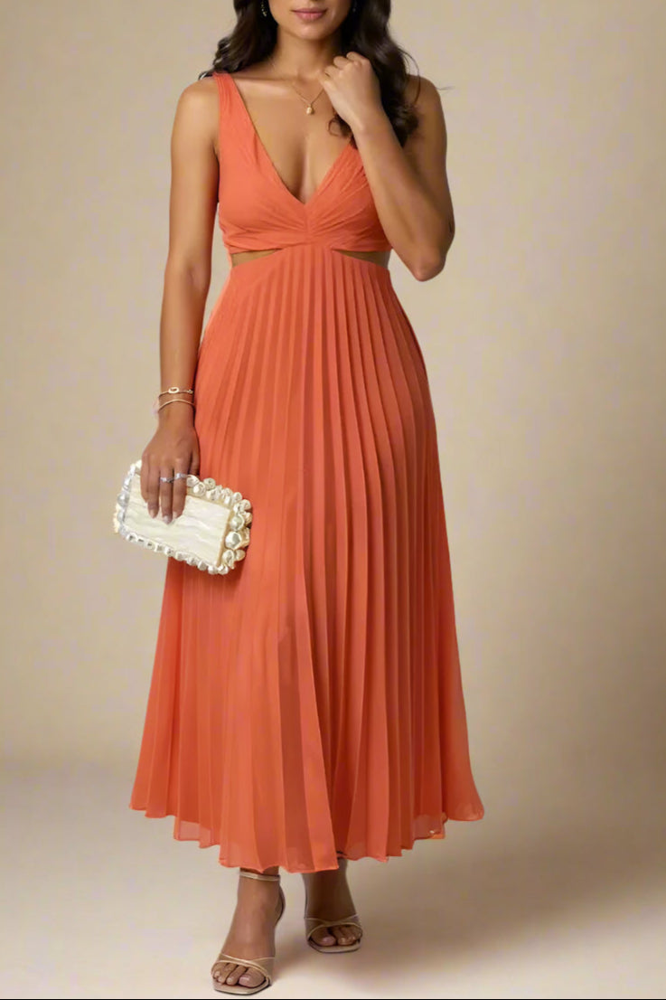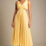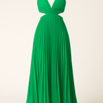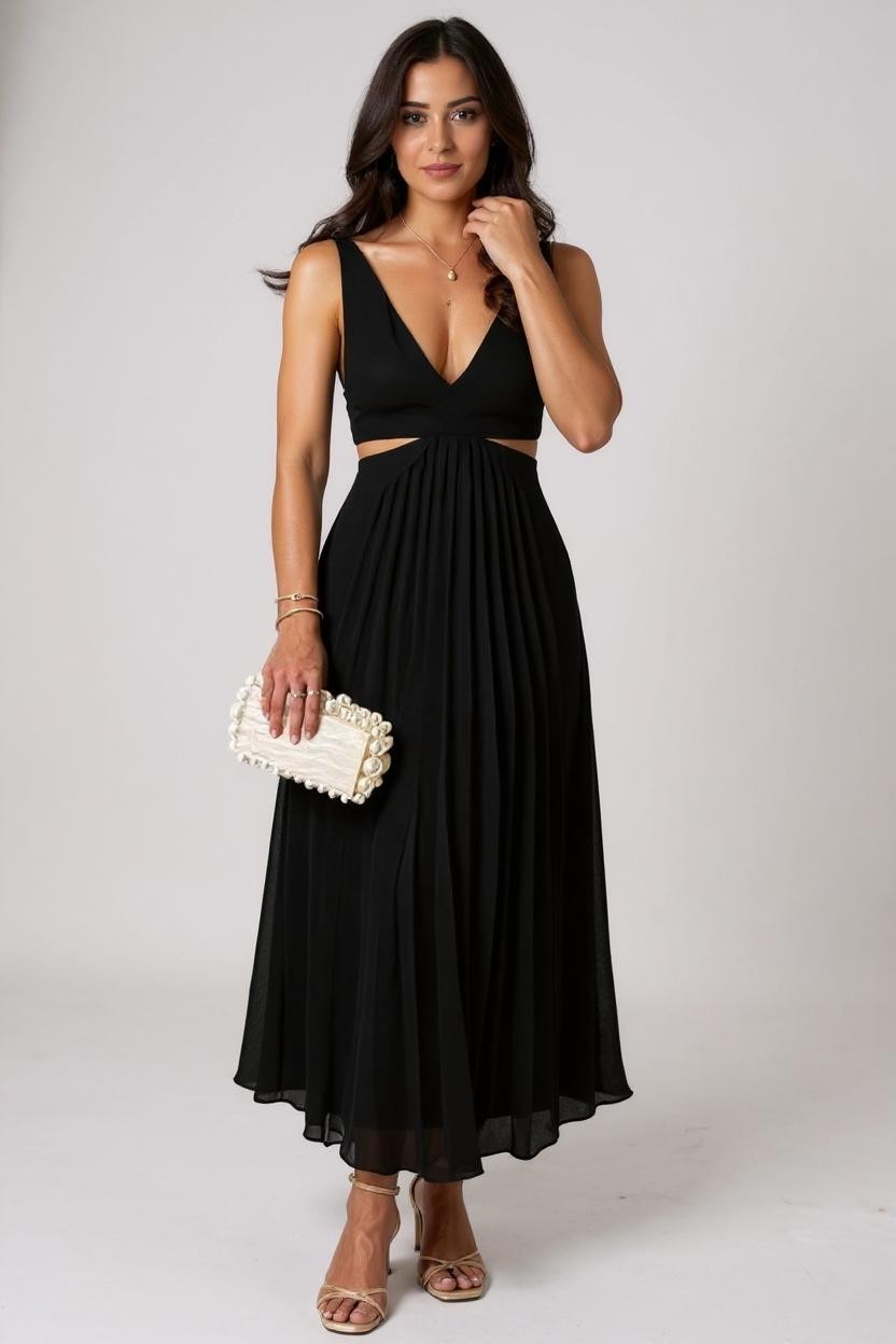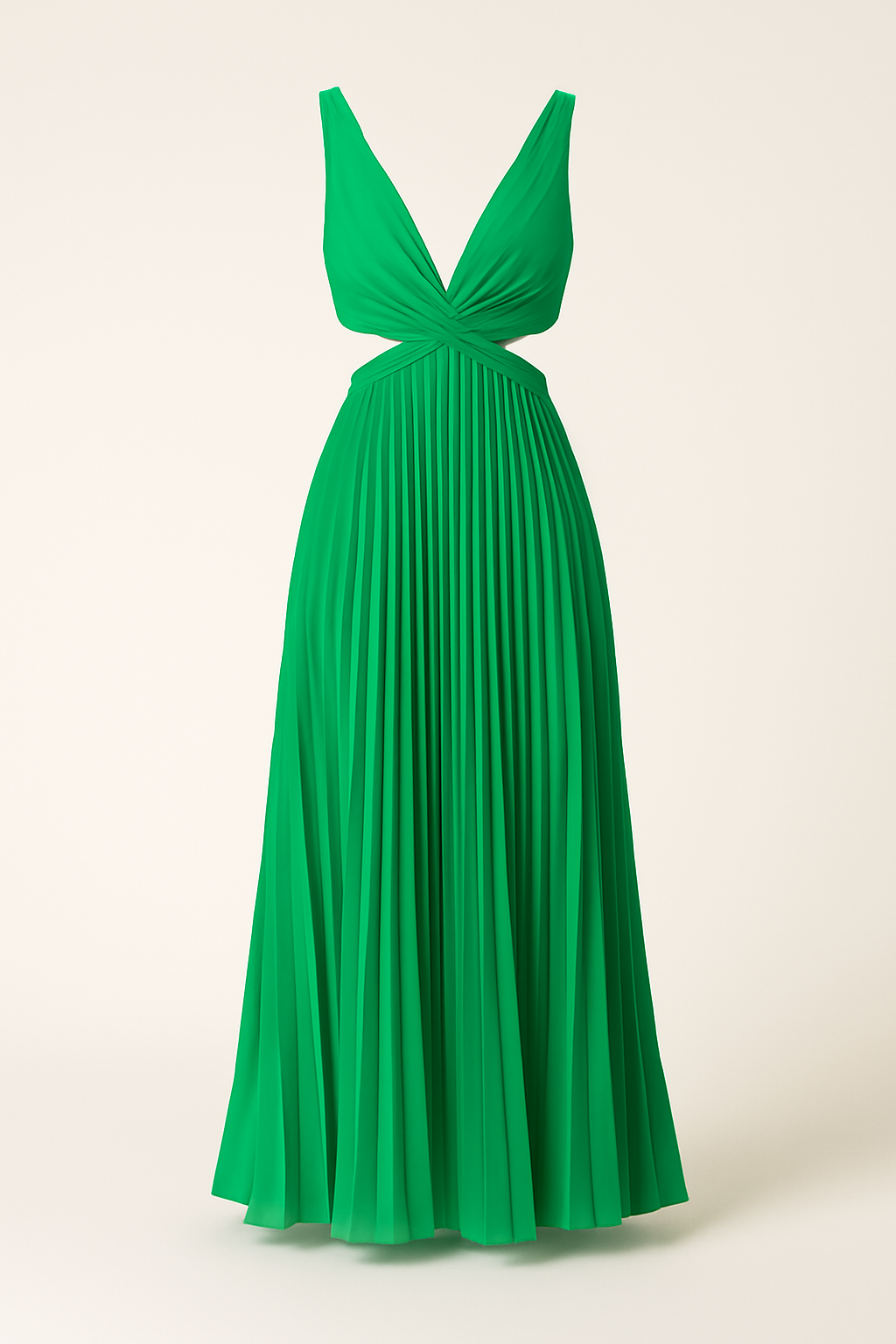 Denne kjole forener elegance og lethed med sit raffinerede design. Den krydsede udskæring og de diskrete udskæringer i siderne fremhæver taljen på en flatterende måde. Det plisserede skørt tilføjer bevægelse og ynde, hvilket gør kjolen ideel til særlige lejligheder eller når du ønsker at føle dig helt unik. Perfekt med fine sandaler og minimalistiske accessories for et stilfuldt udtryk.