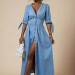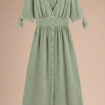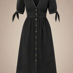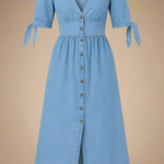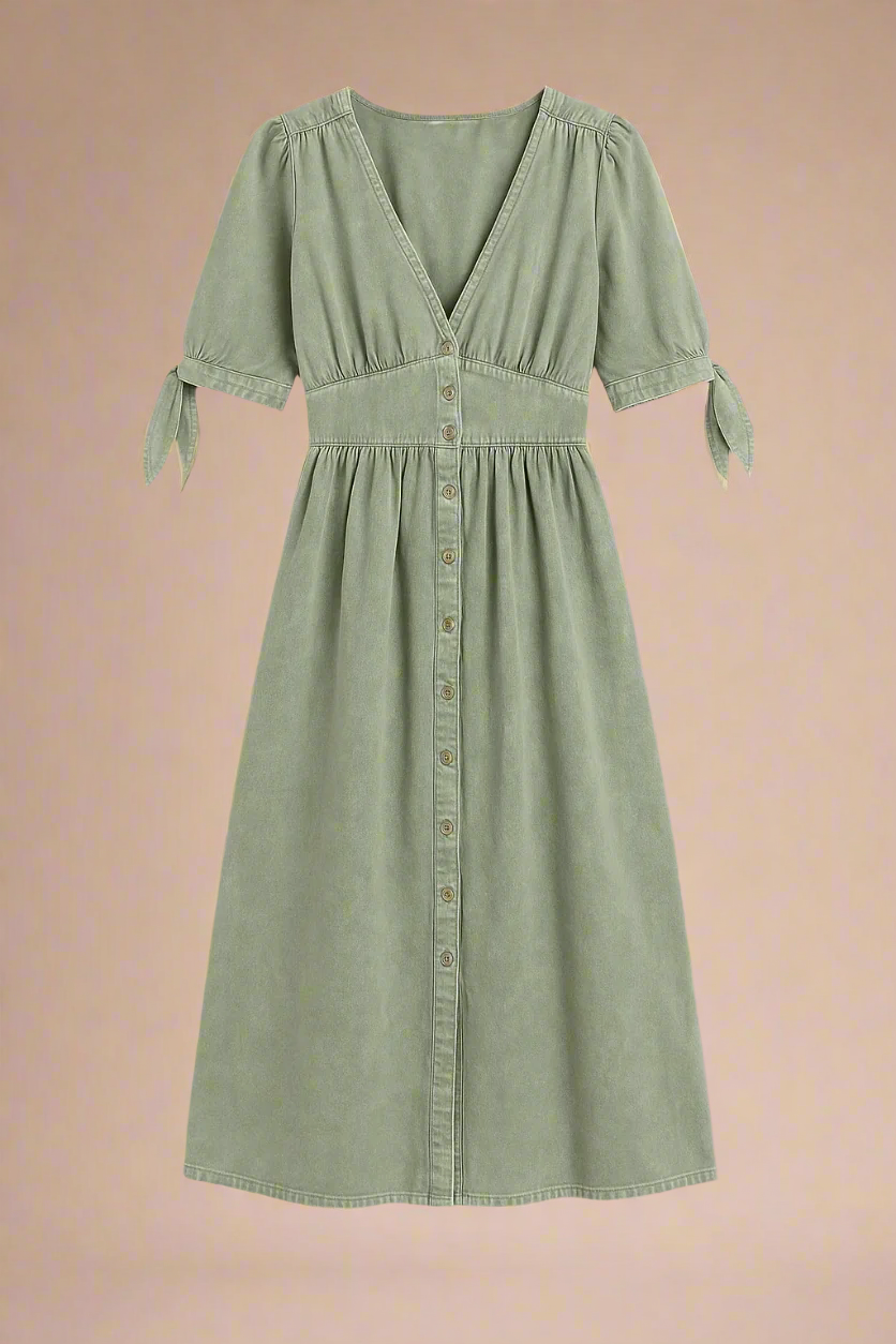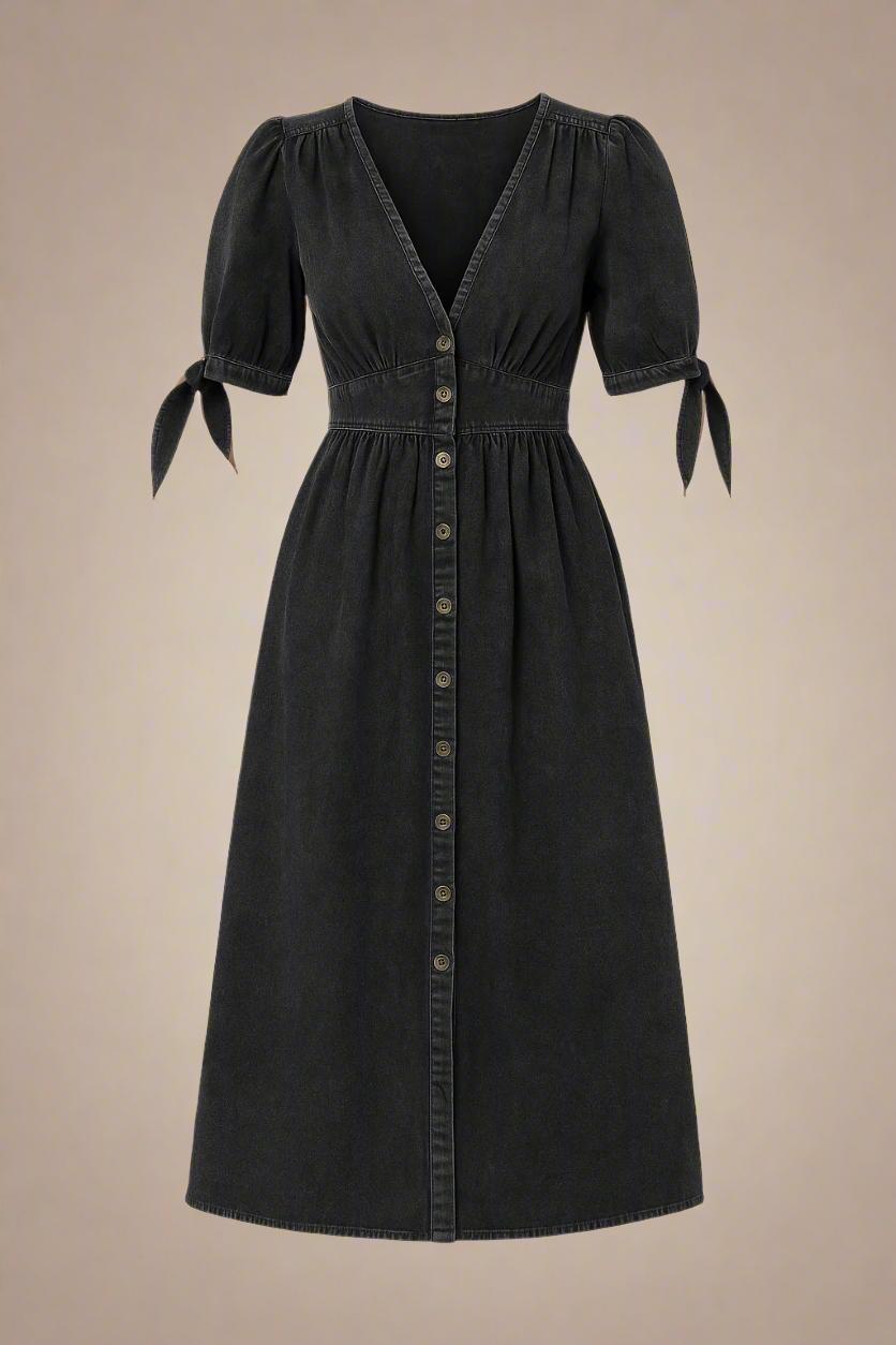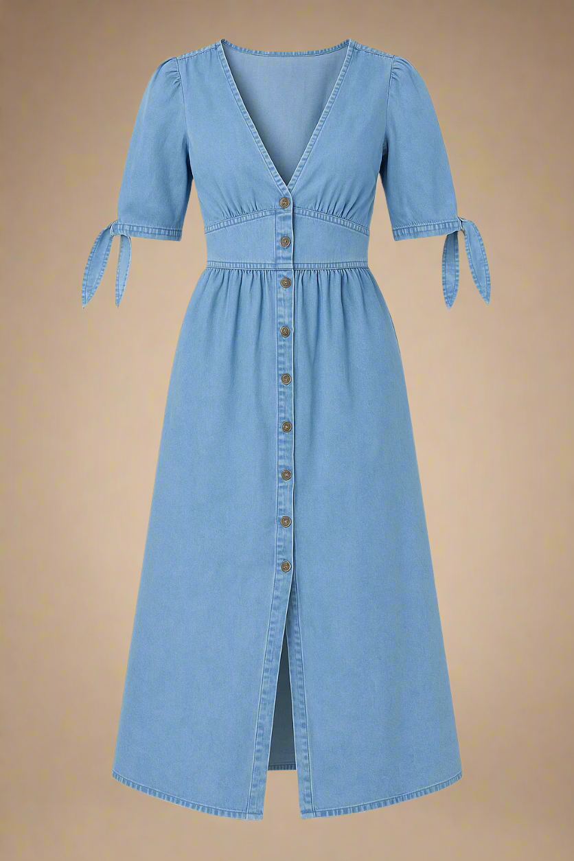 Lang kjole i vasket denim-look med dyb V-udskæring, antikke knapper og bindebånd på ærmerne. Det høje liv og den bløde A-form giver en flatterende silhuet, mens det slidte stof tilføjer kant og karakter. Et alsidigt design, perfekt til både hverdagsbrug med sneakers eller til aftenen med støvletter og accessories.